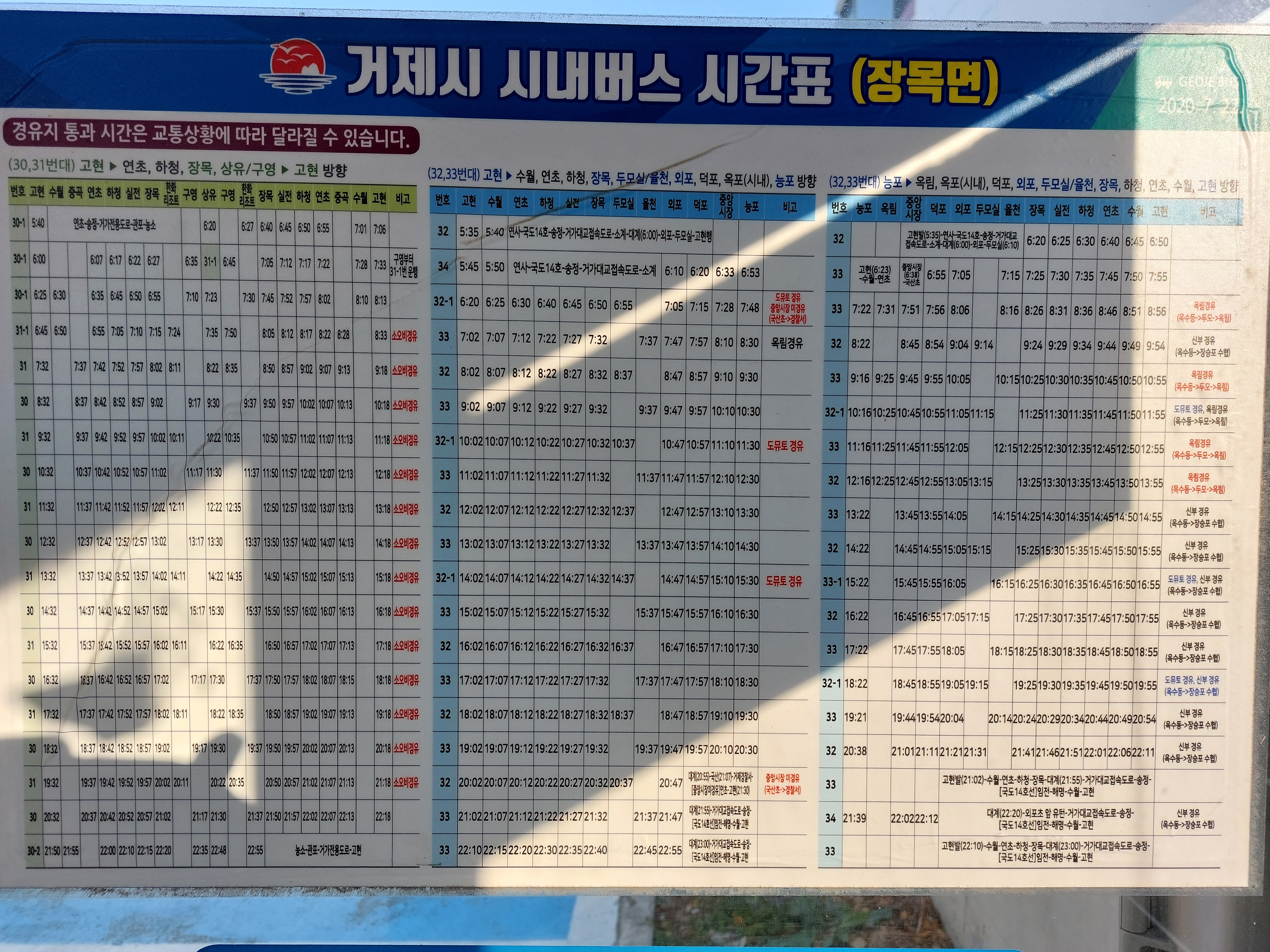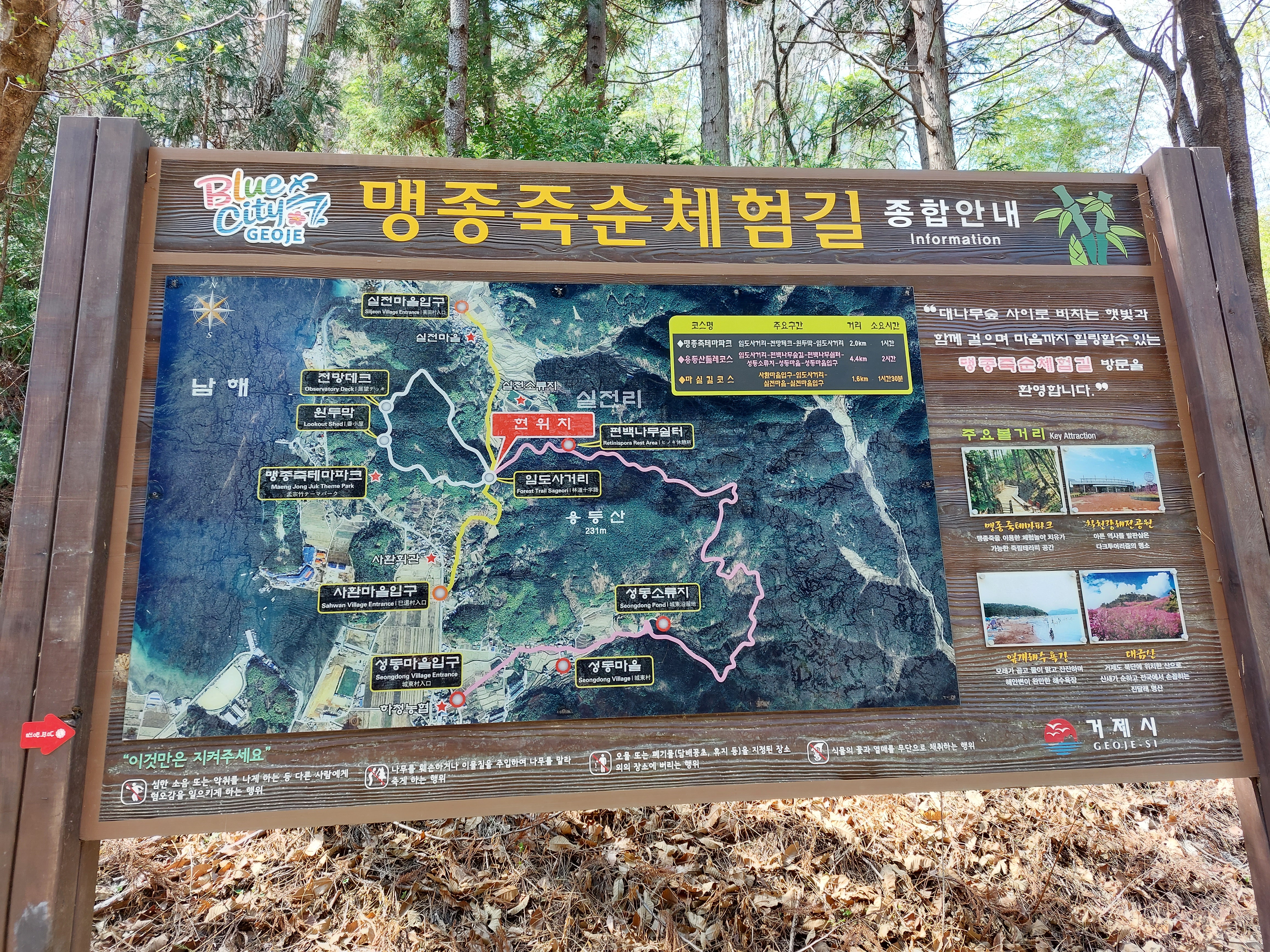 3. 트래킹 코스 : 토월성원 자가용 (06:45) - 거가대교-거제 장목면사무소 주차(07:35) -장목파출소 앞 시내버스(30-1번,07:43)-고현버스터미널 하차(08:10)-터미널 부근 7번교차로(전자랜드앞) 트래킹시작(08:20)-신오교(08:35) -팔각정전망대(09:10)-연사체육공원(10:00)-연사,유계임도-대성사(11:24)-하청119 지역대-하청면소재지 점심(12:30-13:00)-모리고개,맹종죽체험길(13:30)-실전마을(13:40)-장목파출소(14:40)-자가용으로 거가대교 경유 귀가-토월성원