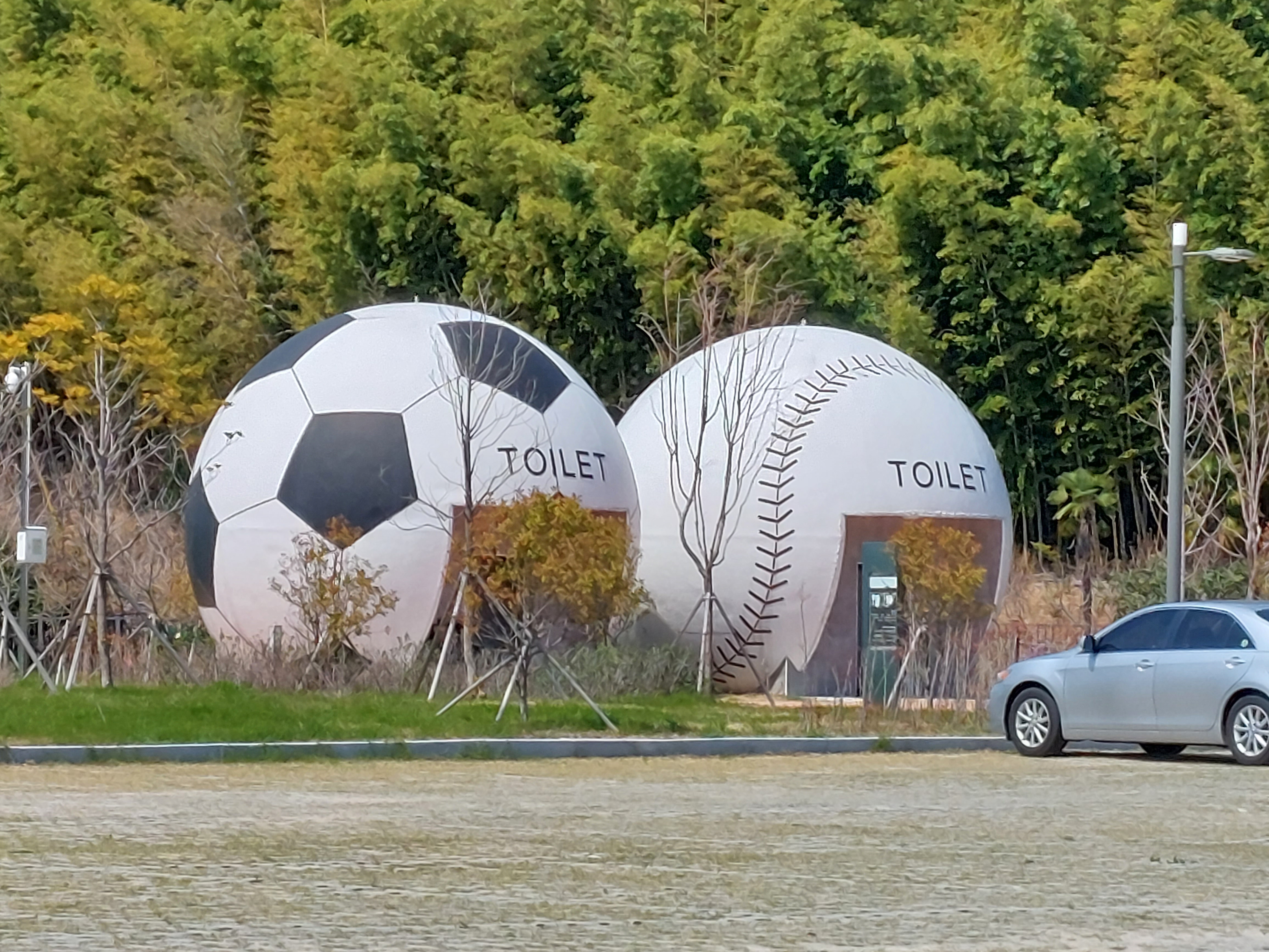축구공과 야구공의 조형물을 이용한 화장실-아이디어 굳!