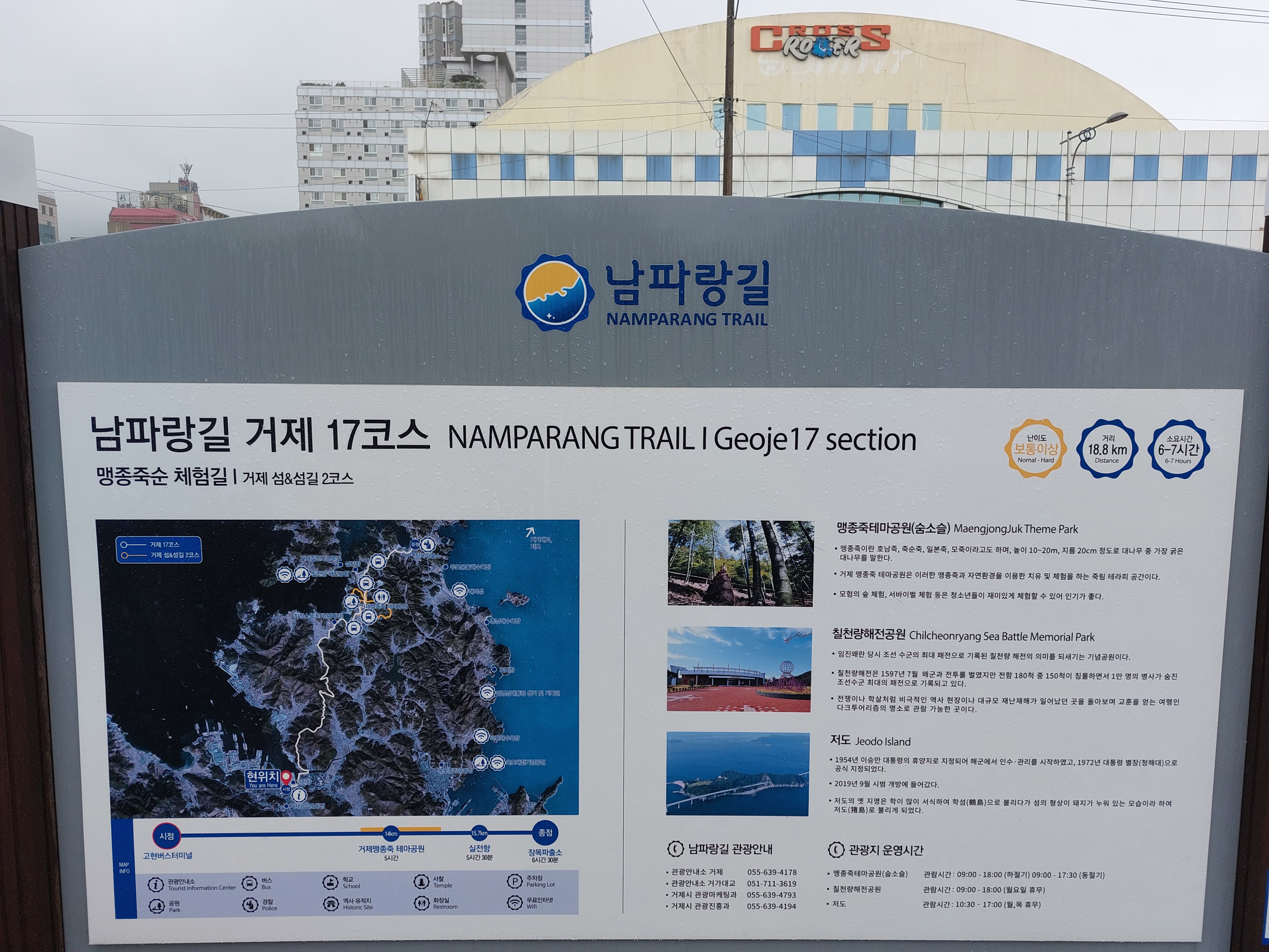 신거제대교 아래의 통영쪽 15코스 안내도.15코스는 통영쪽 9.9km, 거제쪽 7km로 이루어져 있다.