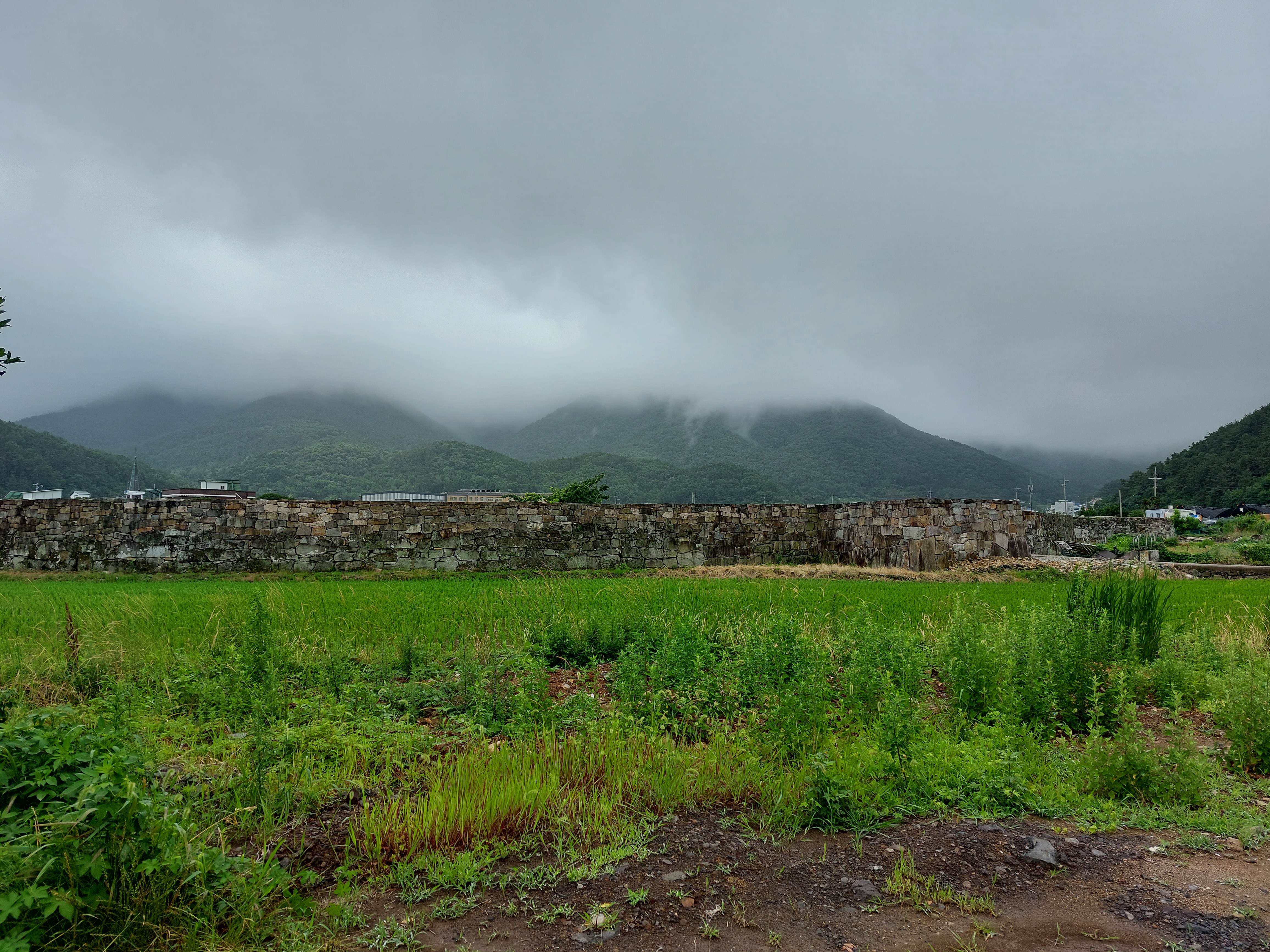 망치산 기슭에서 바라 본 성내 마을 방향-왼쪽 끝에 정상부가 구름에 가려진 앵산이 보인다.