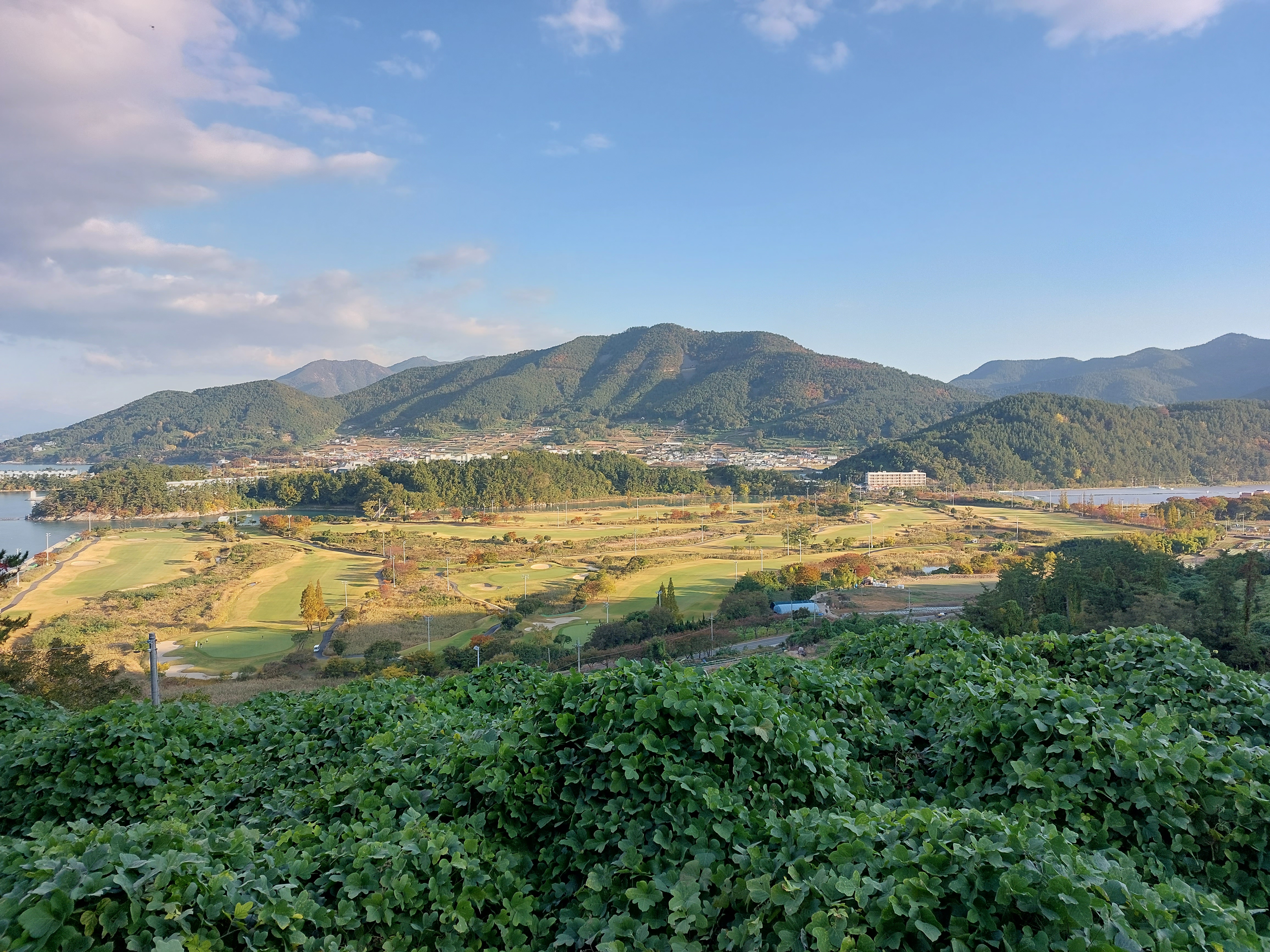 아난티 남해 골프장, 뒤로는 천황산,우측으로는 임진성이 있는 기왕산