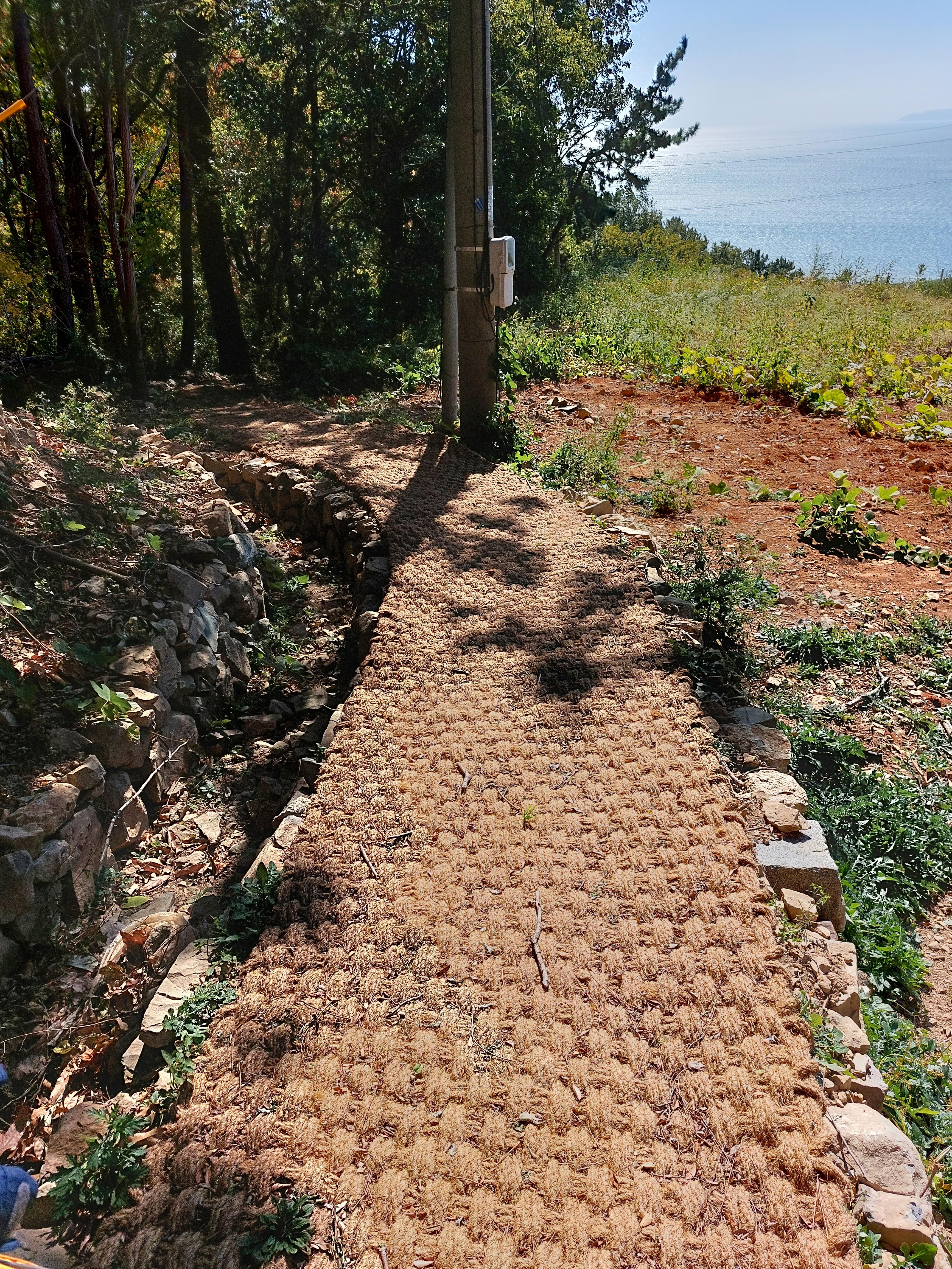 가파른 비탈길을 지나면 이렇게 야자매트를 깔아 길을 손보고 있는 중이다.