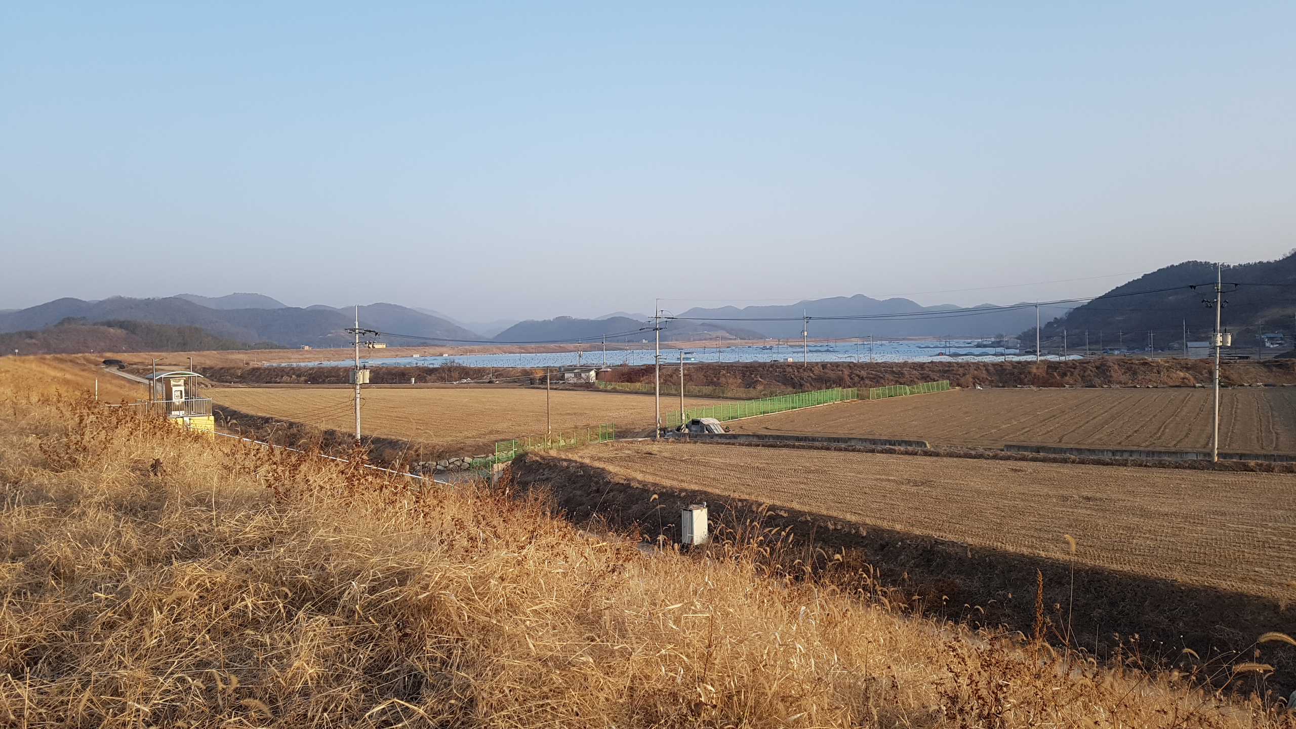 나즈막한 장구산이 보이고 제방끝 장구산아래 배수장에서 오른쪽으로 내려간다. 왼쪽으로는 길이 막힘.
