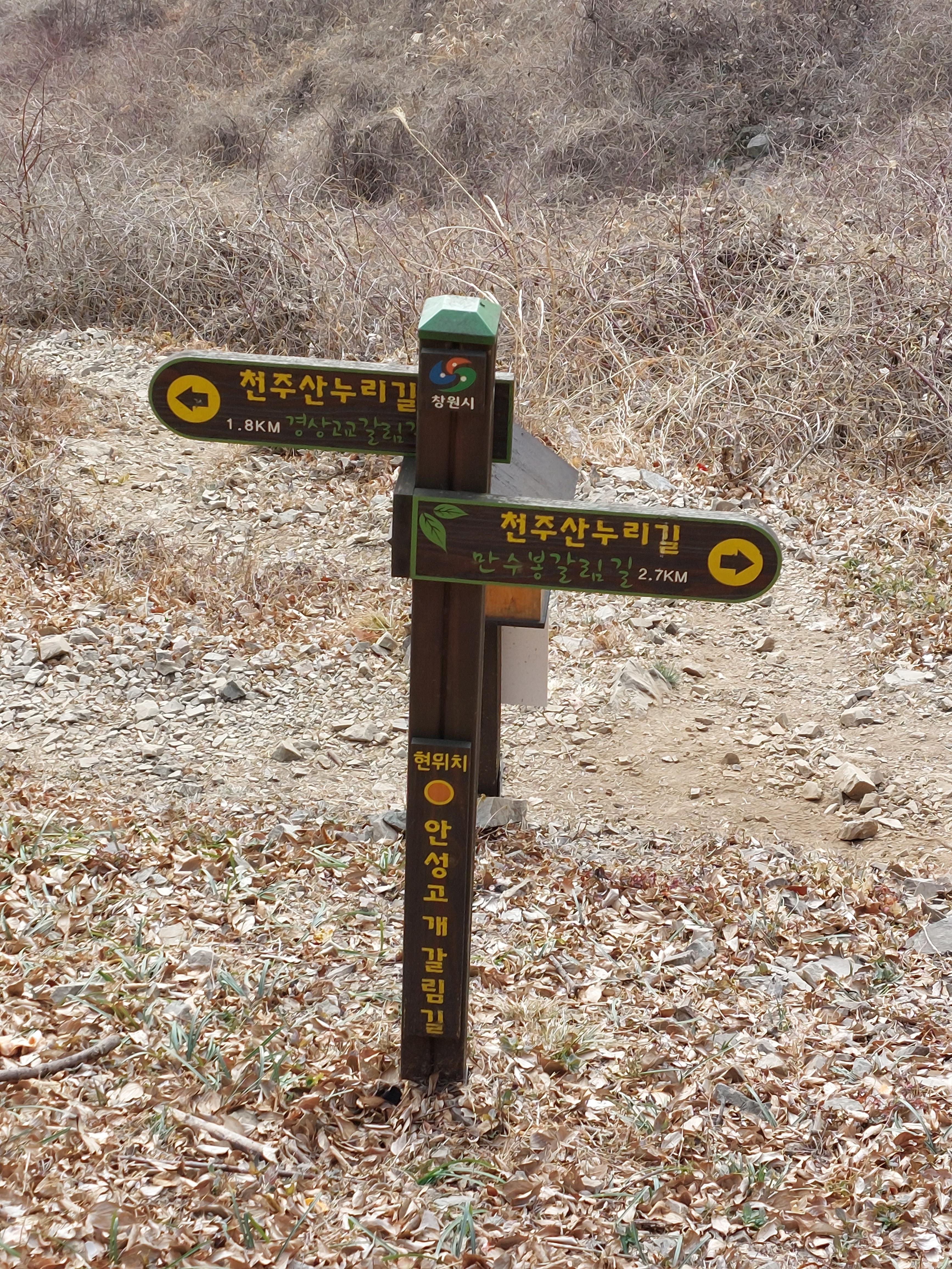 3. 트래킹 코스 : 토월성원(07:10,103번) - 창원역 8번버스환승(08:17) - 구암동한보아파트 정류소(08:25)-약수암(08:31) -안성고개갈림길 쉼터(09:30-09:55)-안성고개,제2금강산등산로능선(11:10-11:40)-안성저수지(12:30)-안성마을 회관(12:40)-240번 버스(13:02)-평성마을 종점 113번 환승-중앙동 한서병원-중앙동5거리 풍전식육식당- 토월성원