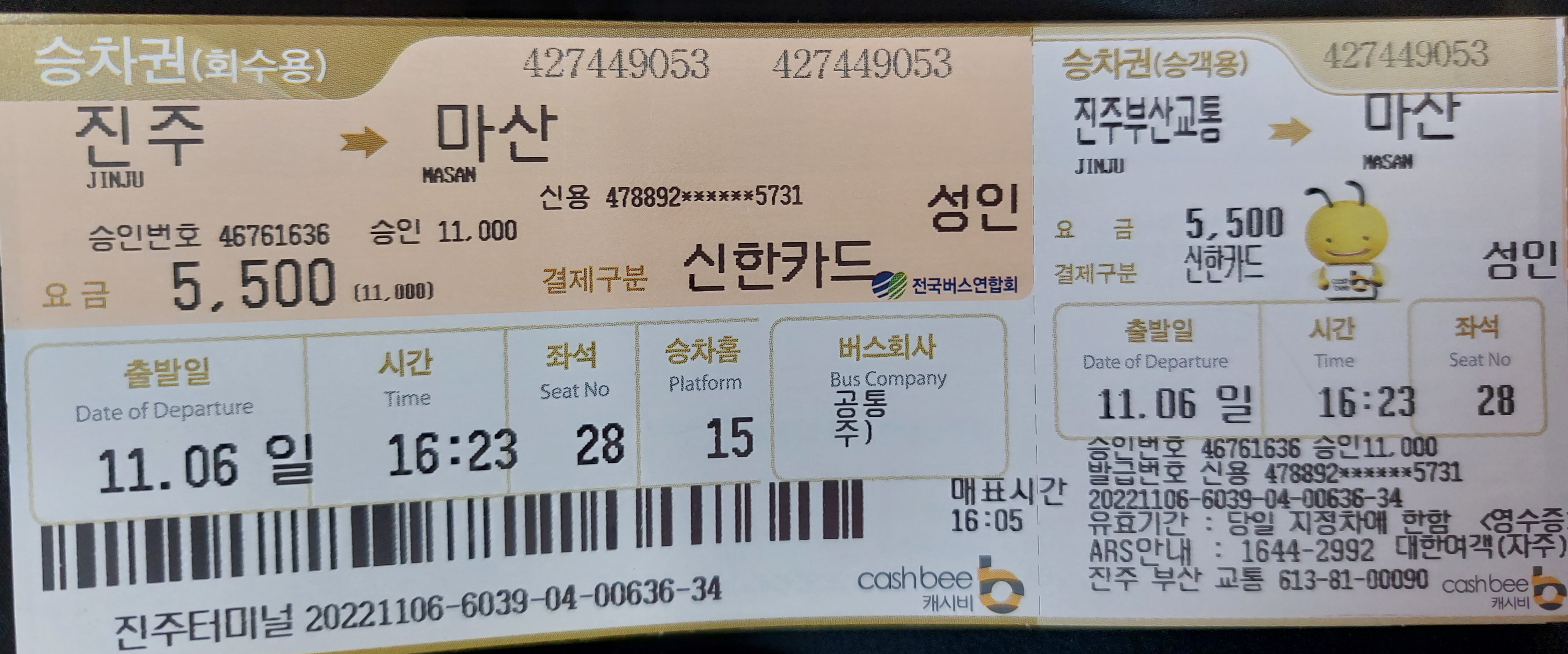 6. 비용 : 창원 시내버스비 5,800(1,450*2인*2회) 창원-대교 버스비 19,000(2인) 택시비 7,000원,하동-진주 12,200(2인) 진주-창원 11,000원(2인), 재첩덮밥 24,000원 수입 10,000원(습득) 계69,000원