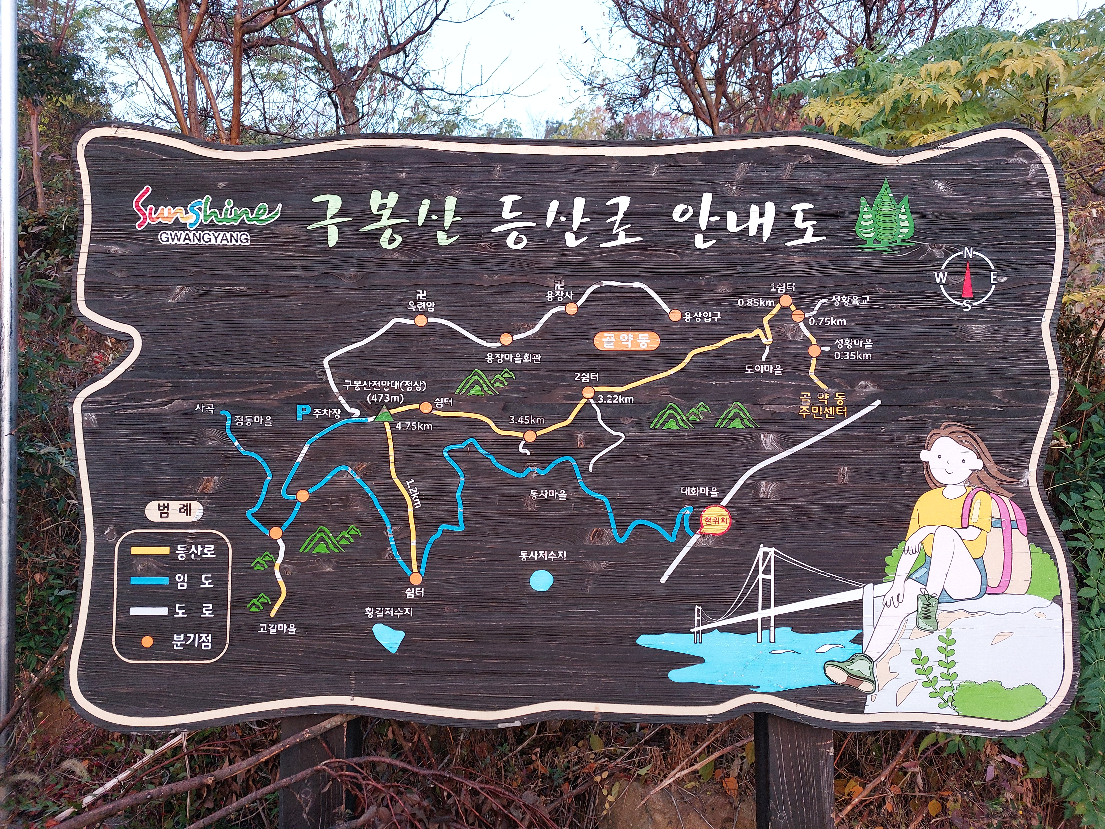 3. 트래킹 코스 : 중동근린공원50코스시작점(06:20)-골약중학교-구봉산 임도(07:10-09:20)-사곡저수지-본정마을-사라실예술촌-석정마을-초남교-유당공원-광양터미널,50코스 종점,51코스 시작점(10:44)-노인복지관앞 버스정류소 991번 승차(11:00)-금광아파트정류소 하차(11:14)-중동근린공원주차장1(11:16)-사천 현불사(12:10)-토월성원
