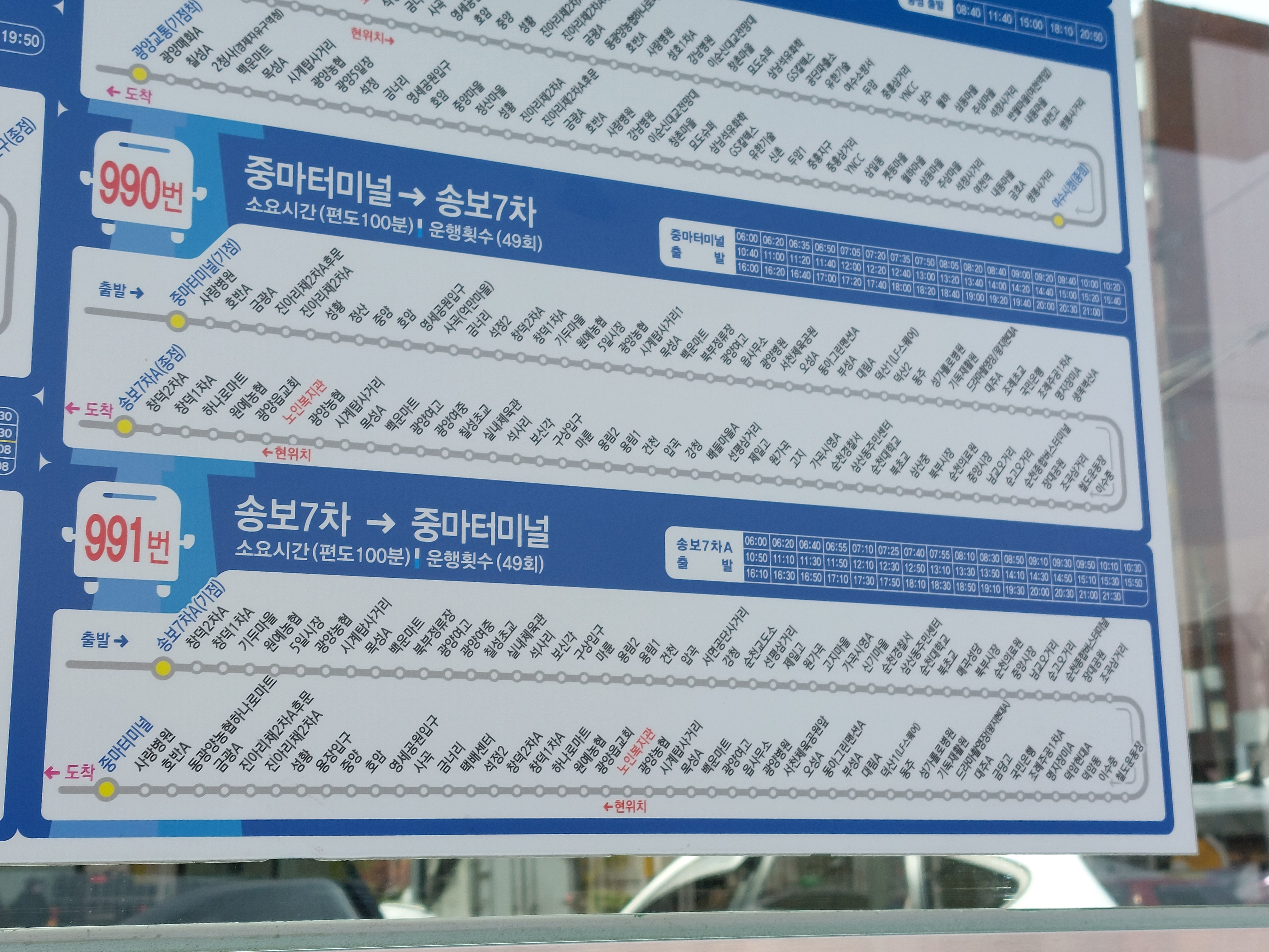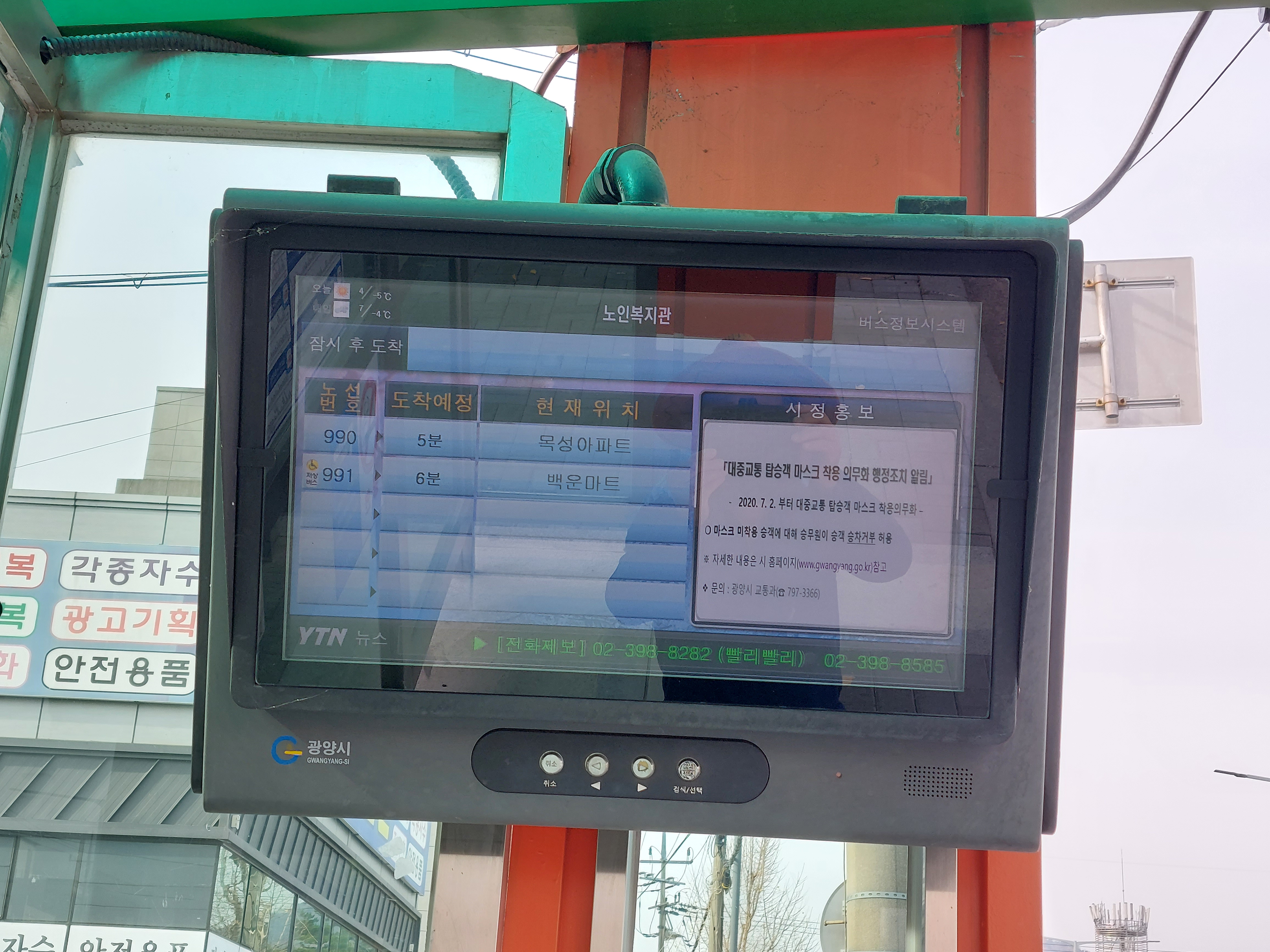 광양5일시장 맞은편에 있는 노인복지관 정류소에서 991번을 타고 금광아파트로 복귀함