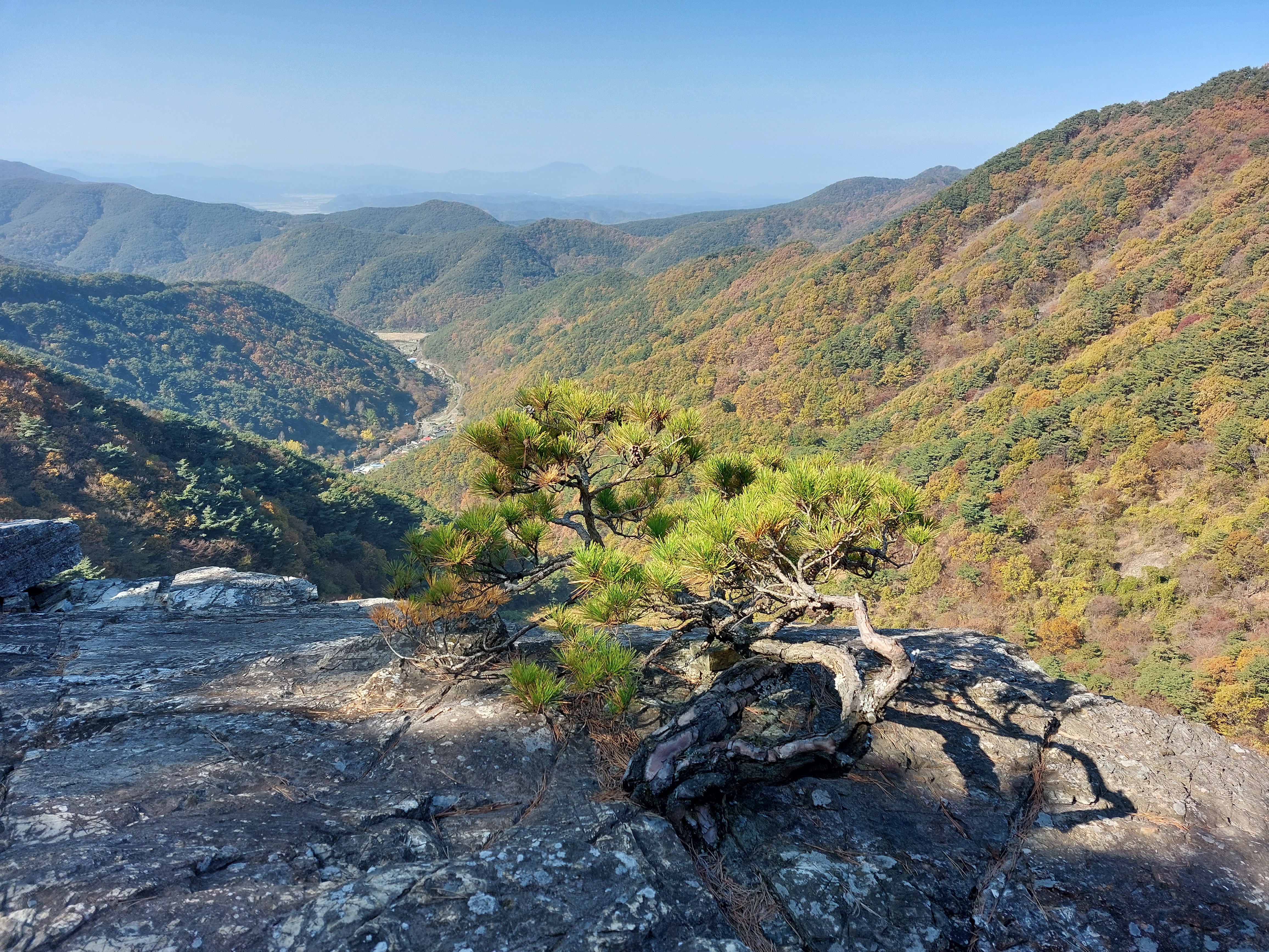 서북산 오르는 길에 조망바위를 만나서 한컷..분재같은 소나무가 바위틈에 뿌리를 박고